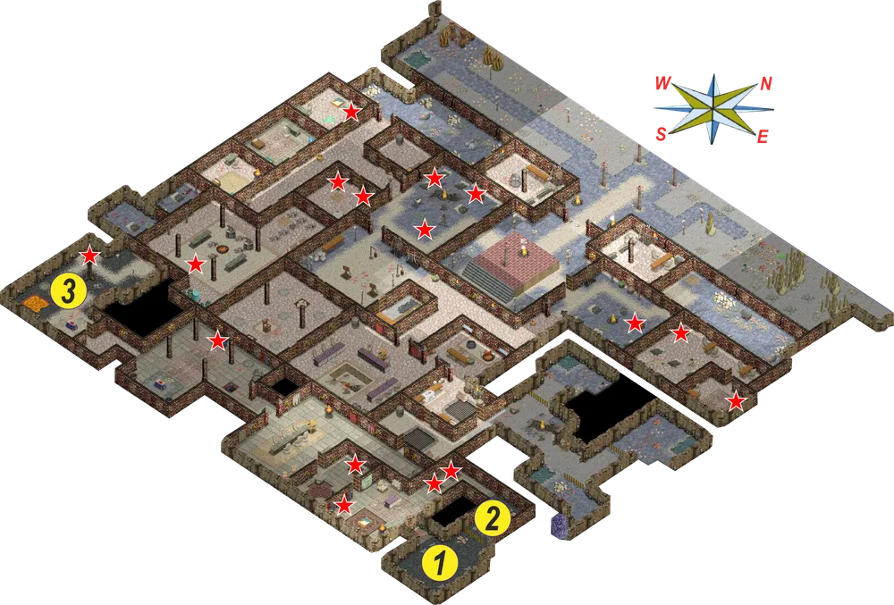 1 – лебедка (открывает проходы к сундукам на западе). 2 – магический барьер. 3 – алтарь.