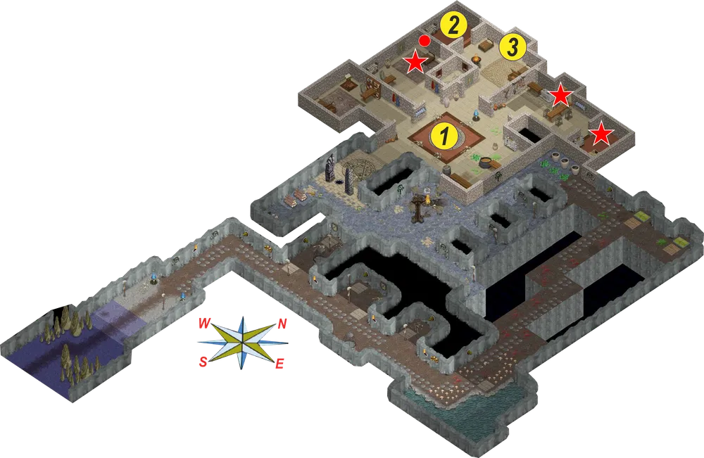 1 – Ионг-Ми. 2 – Тунла-Фар. 3 – магическая книга с заклинанием Вызов шторма. 4 – плавильня Котры. Звездами показаны злобоглазы.