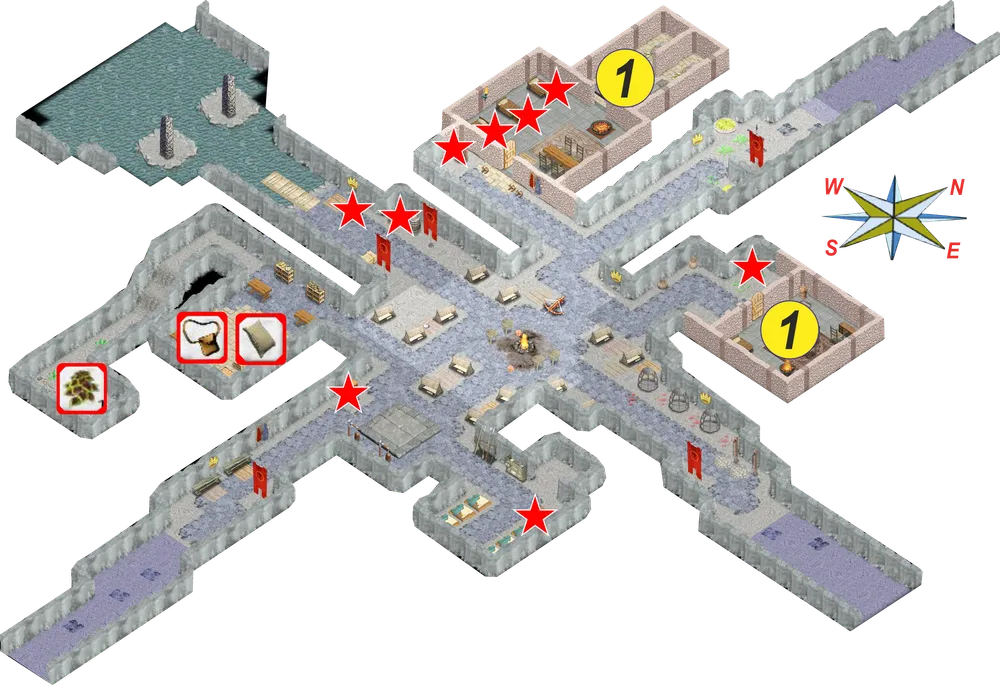 1 – казармы. 2 – магазин Фей. 3 – провизия и выпивка Рорика. 4 – лекарь Юкер. 5 – ресторан Алисы. 6 – магазин луков. 7 – магазин припасов. 8 – маг Уолнер. 9 – лагерь беженцев.
