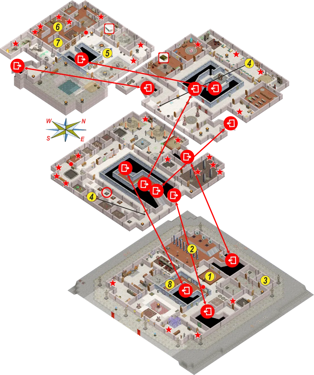 1 – алтарь. 2 – колонный зал. 3 – Киасс. 4 – рычаг, открывающий ворота. 5 – центральный зал. 6 – Элдеран. 7 – три магических книги. 8 – стол.