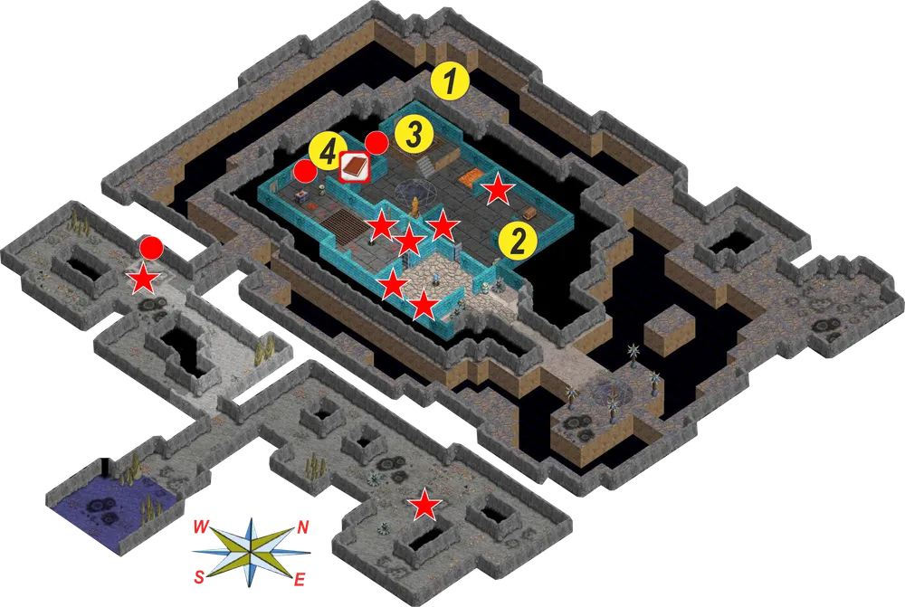 1 – земляные големы. 2 – заклинание Замедление. 3 – Атрон. 4 – сокровищница. Звездами показаны контейнеры, кругами обозначены скрытые кнопки.