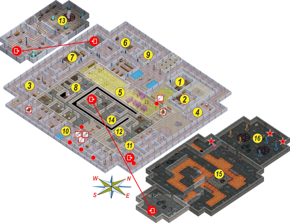 1 –лавка Брендфорда и Гленды. 2 – аптекарь Зантия. 3 – библиотека. 4 – Тронделл. 5 – сад. 6 – кельи учеников. 7 – Эмбрин. 8 – Линда. 9 – читальный зал. 10 – Келнер. 11 – Икс. 12 – священный атам. 13 – Ньюбр (объяснит, как пользоваться магическими пилонами). 14 – запертые ворота. 15 – засада. 16 - Адзе-Хаакай. Звездами показаны контейнеры, кругами обозначены секретные кнопки.