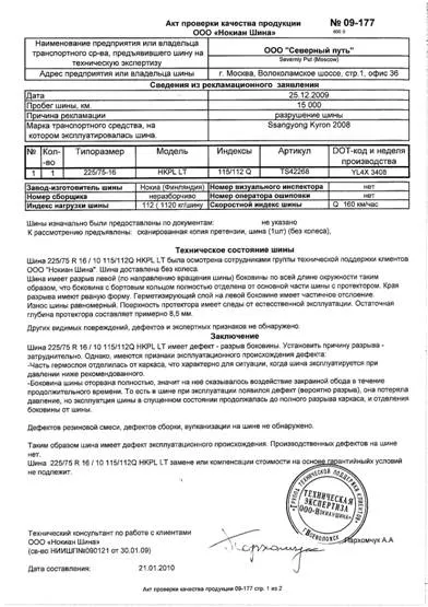 Когда мне продавали данные шины, мне была обещана фирменная гарантия Nokian. Когда я предложил магазину бесплатно предоставить мне новую шину взамен взорвавшейся и бесплатно ее поставить, мне предложили все это сделать за мои деньги. А шину отправить на завод. (А! Вот что важно! Шина то была сделана в Питере! На фирменном заводе данного производителя.) И если завод признает, что выпустил гов… т.е. извините брак… мне обещали вернуть деньги за шину и ее монтаж. Мне стало интересно. И я дал согласие на отправку шины в Питер. Их заключение меня порадовало. Фактически они решили, что я ездил на спущенных колесах.