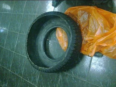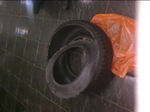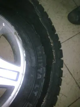 Итак, покинув автомобиль, я начал его осмотр. Для начала я понял, что машина не только на ходу, но и практически не пострадала… Несколько царапин по железу и несколько поломанных пластиковых элементов обвеса кузова не в счет. Далее я попробовал понять, что могло заставить мой автомобиль сделать столь крутой вираж. И к своему удивлению обнаружил, что задняя левая шина «вскрылась». Другого слова я подобрать не могу. Так она выглядела в шиномонтаже. К сожалению после аварии я фотографировать был не в состоянии.