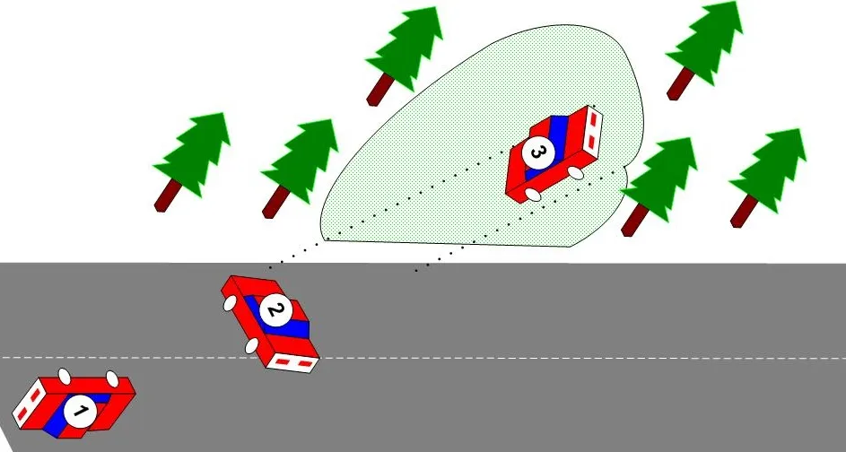 Проехав за первую половину второй зимы еще около 5 000 км однажды (26 декабря 2009 г.) я возвращался из дальней поездки. Находясь в 304 км 700 м от Москвы на трассе А 101 (Москва – Рославль), я чудесным субботним утром ехал домой. Неожиданно автомобиль потерял управление, и машину резко потянуло влево - на встречную полосу движения. Не понимая, что происходит, я применил экстренное торможение и приложил все усилия, чтобы удержать машину в прямом направлении. Когда машина остановилась, и дворники счистили с лобового стекла насыпавшийся на него снег, я обнаружил, что автомобиль находится в кювете. Причем последовательность нахождения машины относительно дороги обозначена цифрами 1, 2 и 3. Т.е. я обнаружил, что меня не только развернуло более, чем на 180 градусов, но и багажником вперед утащило в кусты, растущие на замерзшем болоте. Причем сто метров ранее и сто метров далее места, где я оказался в кювете росли приличные деревья… И попади я в них, я мог бы быть уже не в состоянии писать этот рассказ. Ну а думать о том, что было бы, если бы по «встречке» «шла» фура, я вообще не хочу.