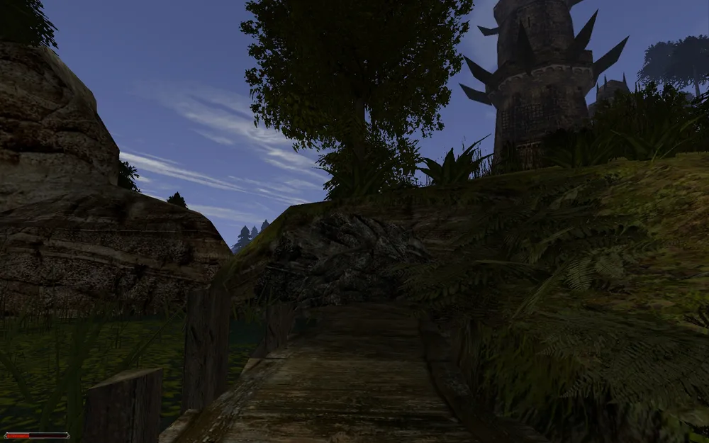 Ну, что ж, давайте выйдем, наконец, из башни и подышим свежим горным воздухом, пропахшим душистой хвоей. :) Вниз от башни ведет аккуратная тропинка. Немного пройдя по ней, по пути прихватив из под пня невероятно ценный черный гриб, можно обнаружить небольшое озеро, с водопадом. Вокруг сплошные заросли, только на лугу, возле, проходящей почти вплотную с озером, тропинки свободно и даже пасется, не весть, откуда суда прибредшая, овца. За нее можно получить 20 опыта, но рука не подымается… Внизу возле воды копошится гоблин – первый серьезный противник... чем-то напомнил мне голлума на рыбалке. Расправившись с ним, соберем растущие возле озера травы и заглянем в кусты, возле дальних скал – там лежит старый одинокий скелет, вокруг которого очень кстати разбросаны стрелы, свитки и даже лук. Тот, из которого стреляют.