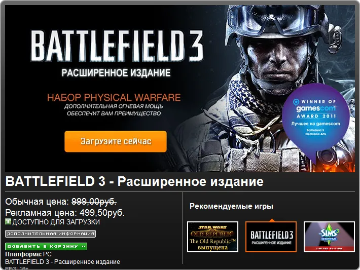 Получается, что этот "Back to Karkand в подарок" оказался всего лишь скидкой 17% на Back to Karkand. А так как набор Physical Warfare станет бесплатным для всех игроков, то никаких подарков за покупку Расширенного издания EA не дали. Разве что вещи для Battlefield Play4Free, которые можно получить при покупке Расширенного издания и после релиза, хотя EA говорили, что эти вещи - бонусы за предзаказ. А если учесть, что в первом письме написано "от 599 руб.", то скидка выходит и то меньше.