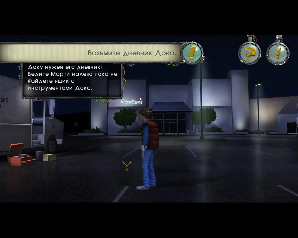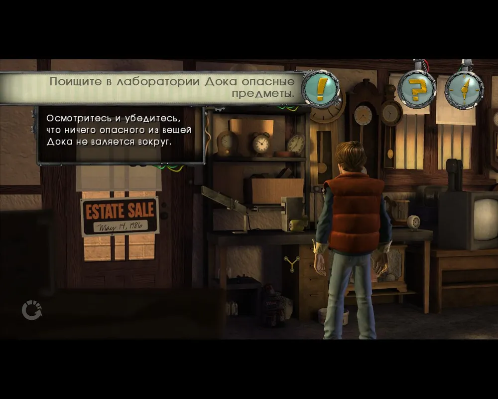 Загрузка сохранений тоже сделана достаточно креативно. При загрузке сохранения мы наблюдаем, как Марти перемещается во времени. Однако интерфейс игры сделан не очень хорошо, потому что он закрывает почти половину экрана. Игра постоянно пытается навязать мне свои ненужные и неуместные подсказки.Вот парочка примеров: