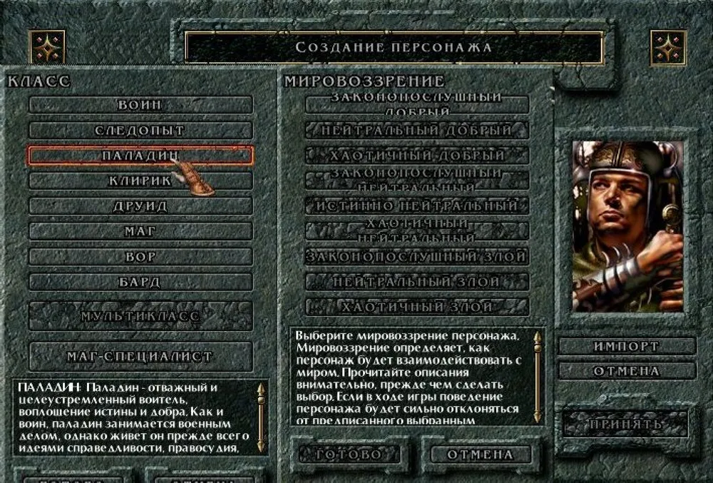 Мировоззрение играло роль и при дуал - классировании: воину, выбравшему «законопослушный - добрый», никто не позволит стать вором; похититель чужих кошельков может быть «нейтрально - добрым» или хуже. Помимо этого, мировоззрение было значимо при комплектации отряда: «злые» и «добрые» спутники героя очень плохо уживались друг с другом, рано или поздно конфликт переходил в поединок со смертельным исходом. (Во время одного из моих прохождений первой части Халид и Джахейра вступили в драку с Кзаром и Монтароном сразу после принятия в отряд!)