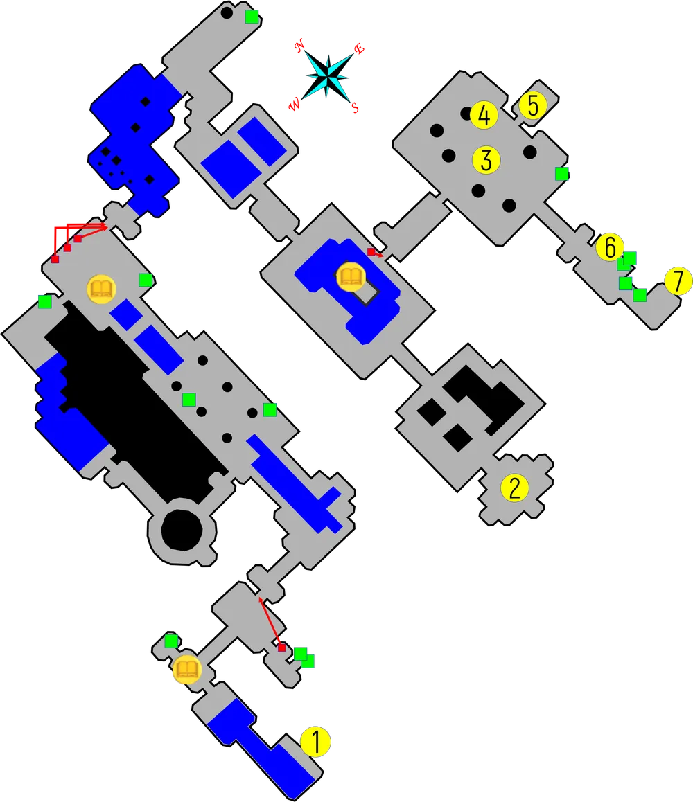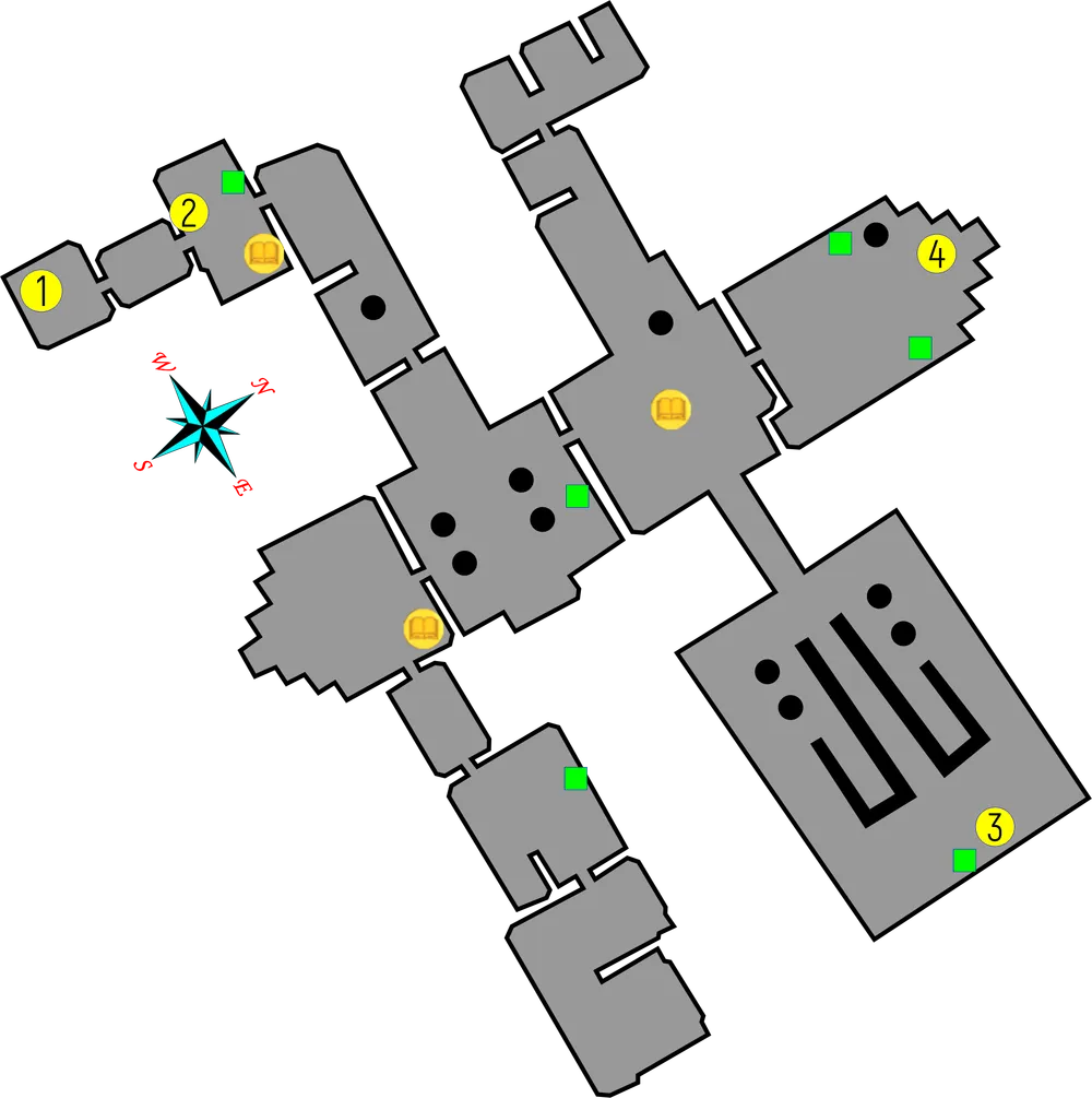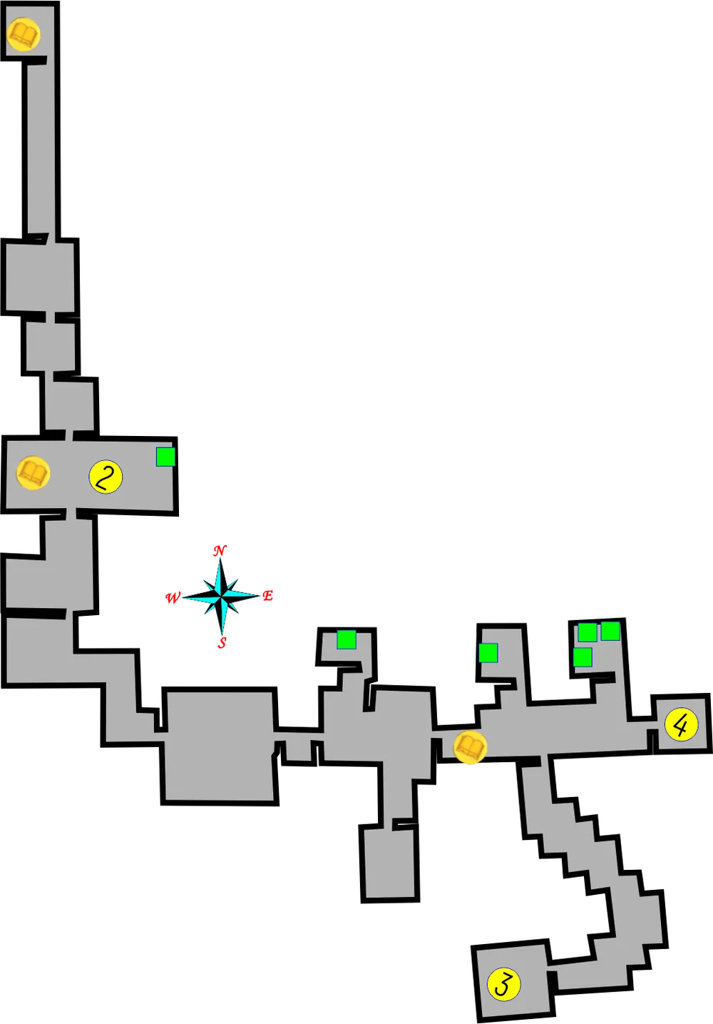 1 – переход на первый уровень канализации. 2 – переход в город. 3 – сокровищница. 4 – переход на второй уровень гильдии. Зелеными квадратами показаны сундуки.