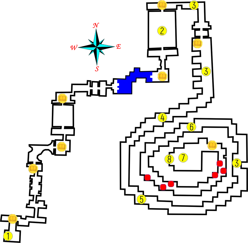 1 – переход на первый уровень гильдии. 2 – большая пропасть. 3 – пауки. 4 – слизь. 5 – споры. 6 – крысы. 7 – Карн. 8 – переход на третий уровень гильдии.