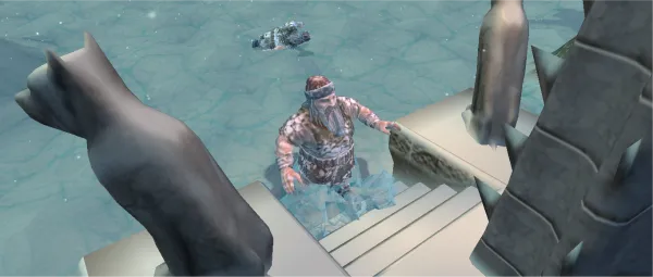 Расправившись с ней, вы найдете ключ от тюремной камеры и горн. Идите в тюрьму, отоприте дверь и поговорите с узником, который находится в камере. Выяснится, что гном Броган (Brogan) является тайным агентом Арфистов Он расскажет вам о гноллах, ограх и драконе, которых подчинили себе темные эльфы для того, чтобы завладеть гномьими шахтами. Когда вы расскажете о телепорте, перемещающем во Врата Бальдура, Броган сообщит о другом телепорте, который ведет в Топи Челимбера. Он поставит метку на вашей карте и расскажет, что телепорт находится в запечатанной льдом пещере, открыть которую можно при помощи горна.