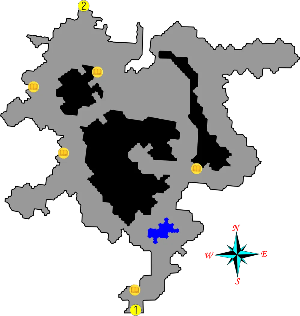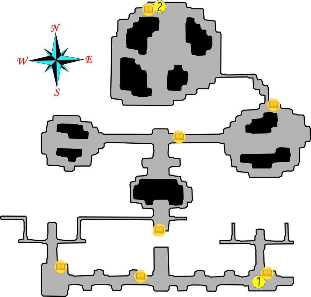 1 – переход в шахтерский лагерь. 2 – волки. 3 – гноллы. 4 – йети. 5 – переход в волчью пещеру (зелья исцеления). 6 – точка перехода. 7 – переход в сокровищницу. 8 – переход в западную часть Пылающего Глаза. 9 – переход в восточную часть Пылающего Глаза. 10 – переход в пещеру Колгрима. 11 – Колгрим. 12 – мертвый гном. 13 – переход в ледяную пещеру. 14 – сигнальная башня.