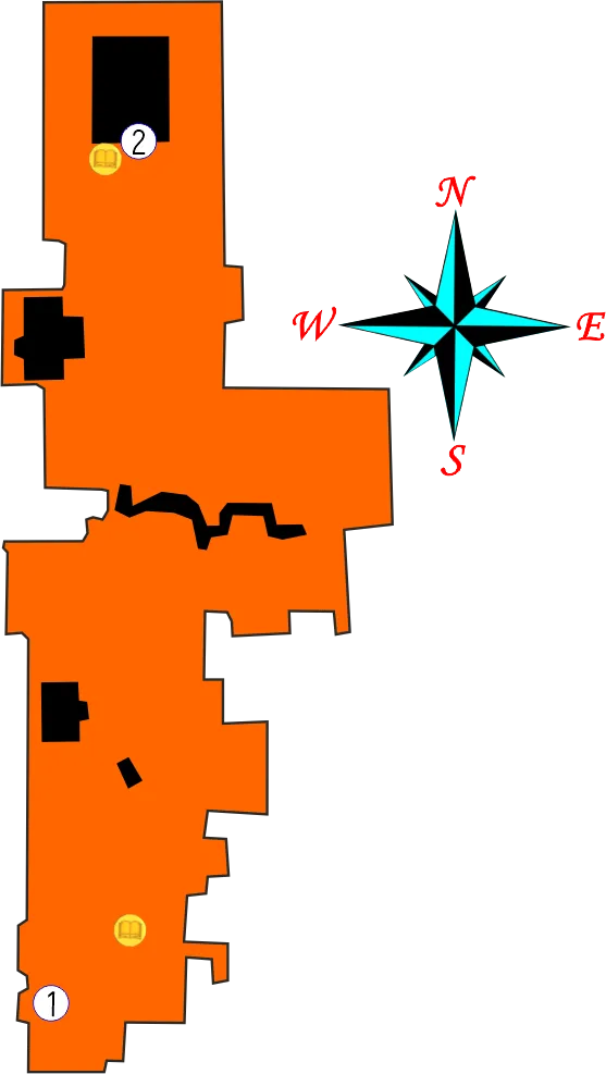 1 –переход на торговый путь. 2 – переход в логово гоблинов. Звездами показаны места, где находятся сундуки. Оранжевыми кругами показаны шатры гоблинов.