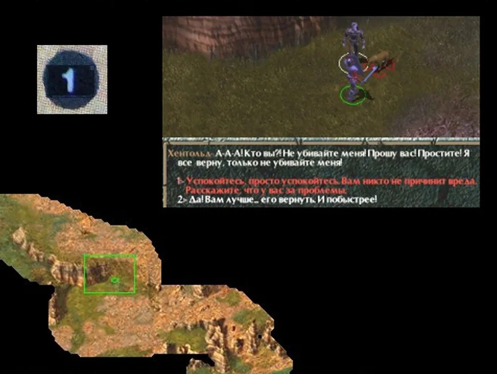Олаф поговорил с мэром, отказался принять чужое золото у Оублека («Чёрт! Что же я делаю?!») и пошёл через мост на поле, выкапывать очередное сокровище. Тут к магу пристал Нубер… Попробуйте отыскать клад, когда каждые несколько секунд вам задают идиотские вопросы! Герой с недоброй улыбкой обнажил свой кинжал, и как раз в этот момент любитель поговорить то ли устал, а то ли просто испугался; позволив магу ещё раз повысить уровень. Отделавшись от назойливого и забрав клад (Х 187, Y 2744), герой отправился за следующим.
