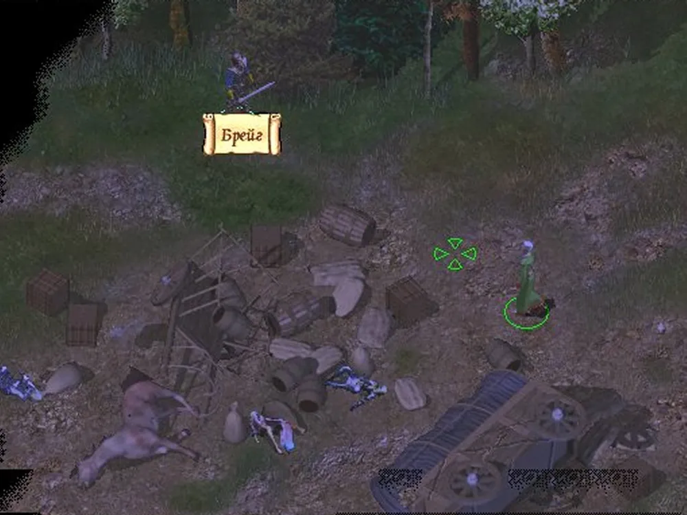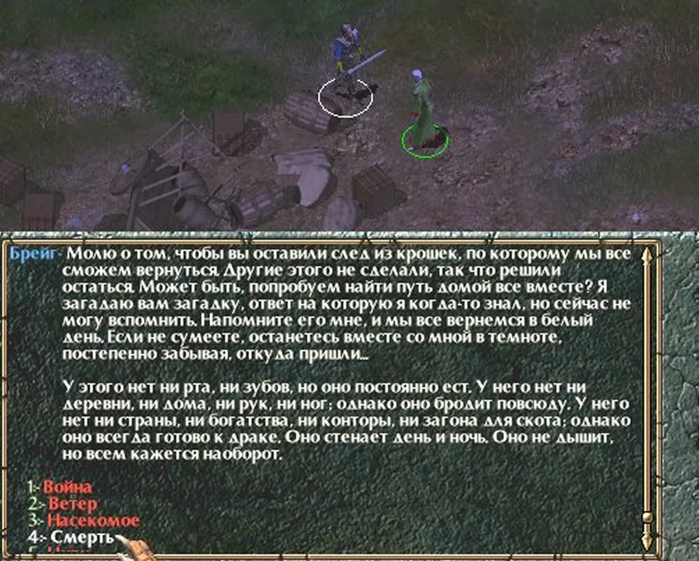 Всё-таки не повезло: погнались Гноллы, сразу несколько. Нечего и думать сражаться, надо бежать, спасаться! Убегающий герой неожиданно влетел на место жуткого побоища и сразу же был вынужден отвечать на загадку, причём неправильный ответ грозил смертью.