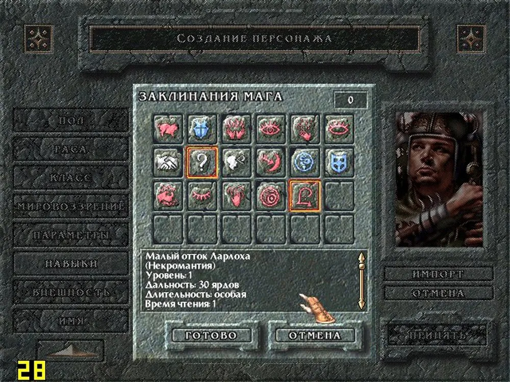 Оружейное умение – кинжал; скорость его атаки выше, чем у посоха, а дистанционное оружие в руках мага вообще никуда не годится. Первые заклинания: «Опознавание предметов» (Платить по сто монет за определение каждого неизвестного предмета?! Ещё чего!) и «Малый отток Ларлоха».
