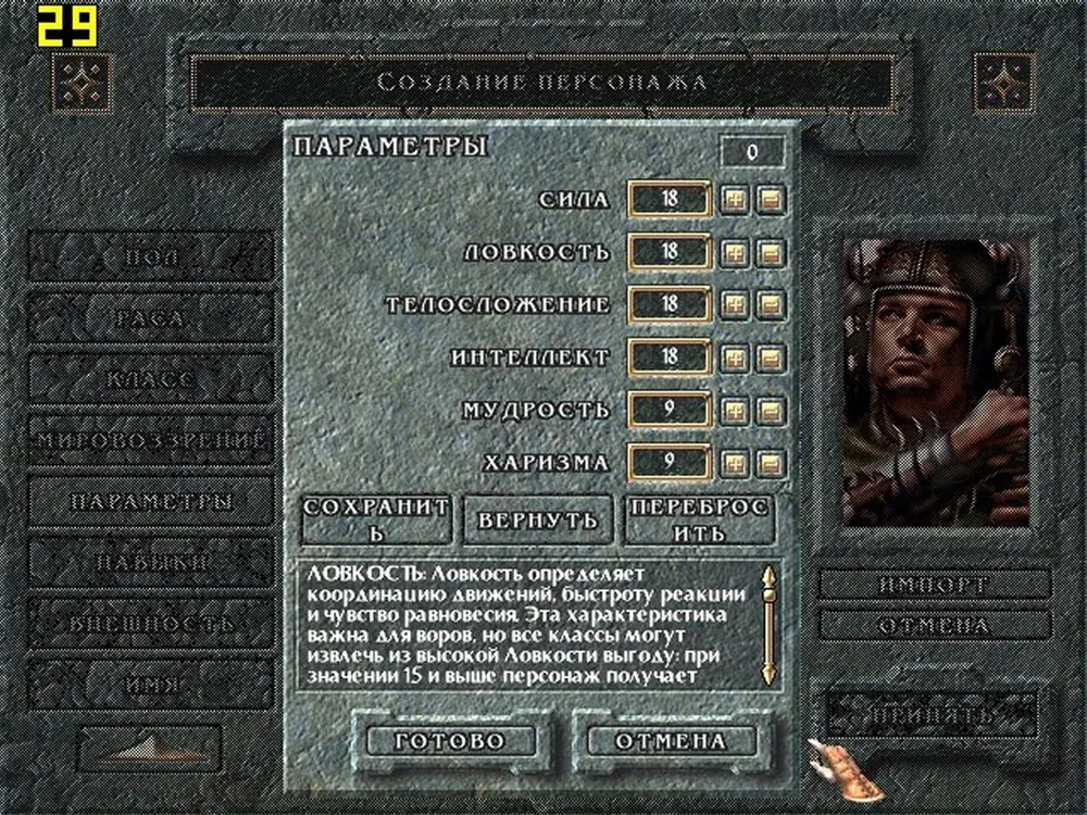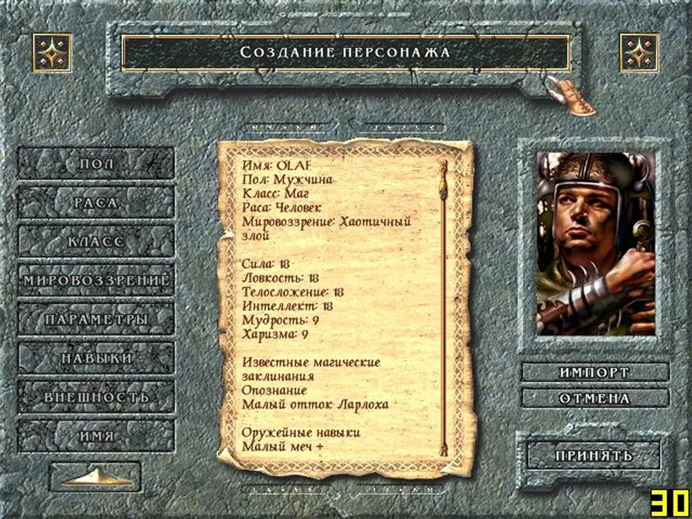 Через небольшой промежуток времени (создателю так не показалось!) Олаф убедился, что его основные характеристики имеют максимальную величину – «18», а мудрость и привлекательность равны девяти. Неплохо!