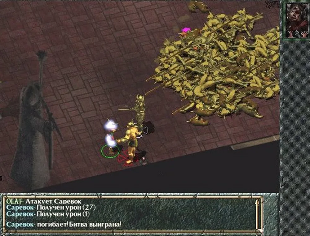 Вошёл, выпил все ускоряюще-усиливающие зелья и побежал вперёд по правому краю, стараясь не приближаться к стене и ни в коем случае не наступить на центральный символ. Когда, по расчётам Олафа, впереди должен был показаться престол – метнул в темноту огненный шар и сразу же призвал монстров. Увы, метнул не слишком удачно: активизировался не только Саревок, но и вся его свита; в гущу сражающихся полетели вражеские взрывающиеся стрелы, а коварный маг перекрыл выход из храма. Им и занялся герой в первую очередь… Пара стрел, нейтрализующих магию – и враг беззащитен. Другая пара – и он мёртв. Между тем почти все монстры погибли под взрывами.