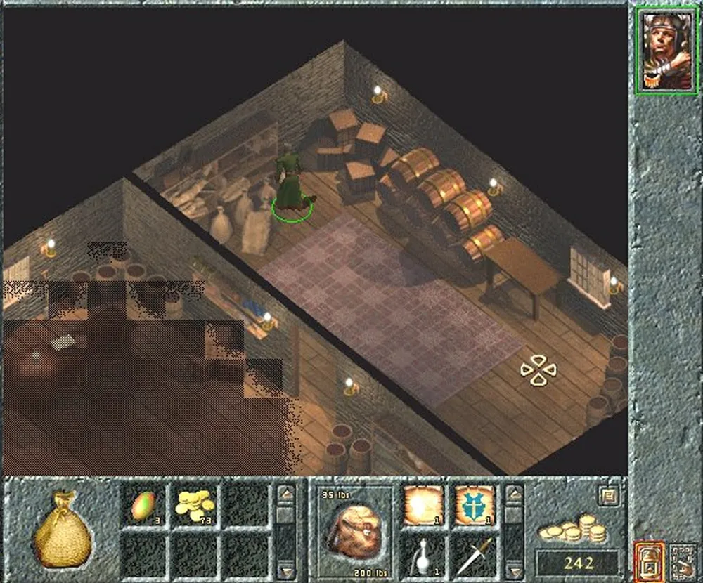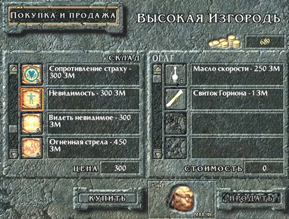 Однако встреченные пауки моментально выгнали героя наверх; пусть лучше воин с ними разбирается. И стал Олаф воином… Благодаря запасливости мага доспехи, щит и меч лежали в одном из сундуков дома рядом с таверной «Дружеская рука»; там же был припрятан запас зелий и – самое драгоценное! – кольцо невидимости; маг купил его в таверне «Бороды Ульгота». Две звезды в большой меч, две – в лук. Можно идти, вот только куда? Воин решил, что тридцать единиц здоровья для него – маловато, и отправился за книгой, повышающей телосложение.