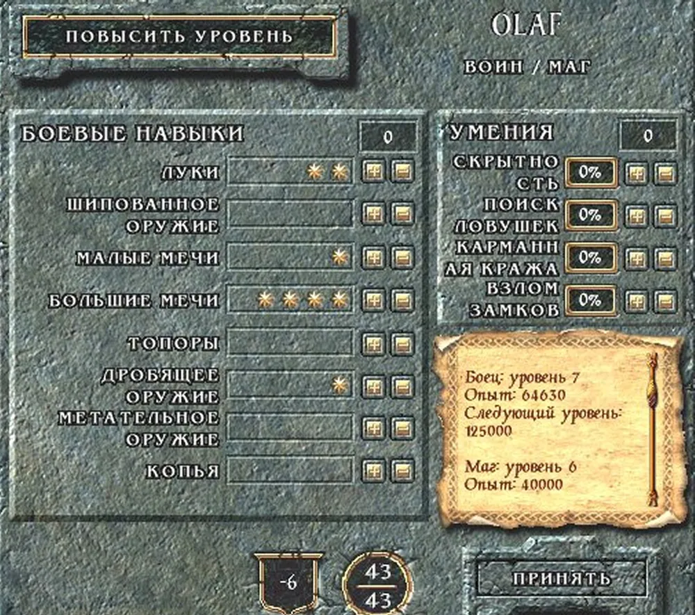 Пятый уровень… Время принятия решения: переквалифицироваться в воина или побыть магом ещё немного, чтобы получить пару дополнительных слотов под заклинания? Риск: вдруг не успеть получить семь уровней воина до финальной битвы? Герой так и останется воином, без возможности метнуть огнешар или призвать монстров. Олаф раздумывал недолго: за время странствий он привык к риску; и остался магом. Даёшь шестой уровень!