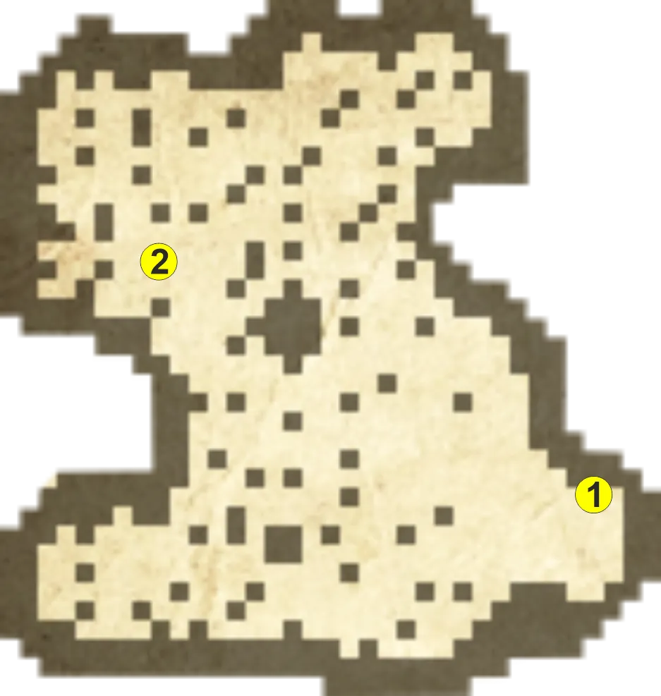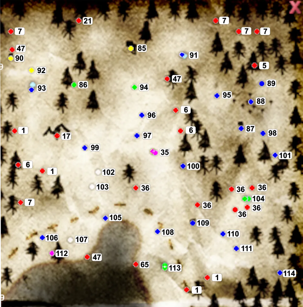 1 - медведь. 5 - зараженный клещ. 6 - клещ. 7 - пауки. 17 - големы. 21 - волки. 35 - телепорт. 36 - богомол. 47 - личинка. 65 - болотный голем. 85 - дом Спайка (см. ниже 3.3. Родня). 86 - больной тролль. 87 - склеп. 88 - старое кладбище. 89 - портал. 90 - дом Флеты (см. ниже 3.1. Лекарство для Флеты). 91 - волчья пещера (см. карту ниже). 92 - Флеминг (см. ниже 3.2. Старые доспехи). 93 - пещера огоньков (см. карту ниже). 94 - призрачный олень (его череп светится в темноте). 95 - кладбище. 96 - сундук. 97 - хранилище (Разрядив ловушки на земле под рычагами, поверните два средних рычага вниз. Сдвинется стена. В сундуке вы найдете: свиток телепорта к себе Виджа, темные кожаные перчатки, тяжелый меч). 98 - могила лорда Бенедикта. 99 - хранилище (используйте зелье превращения в маленькую крысу, чтобы проникнуть внутрь через небольшое отверстие в южной стене). 100 - сумка. 101 - сундук. 102 - колодец. 103 - источник маны. 104 - гробница обелисков (см. карту ниже). 105 - светильники (Зажгите все светильники и встаньте на плиту между ними. Вы переместитесь на соседний остров, где сможете забрать добычу из сундука. Чтобы вернуться назад, зажгите светильник на острове). 106 - обломки. 107 - острый забор. 108 - сундук (Путь к нему преграждает магический огонь. На стене над сундуком имеется рычаг, который необходимо повернуть, выстрелив по нему магией или стрелой, что погасит огонь). 109 - сгоревший дом. 110 - невидимое здание. 111 - вход в невидимое здание. 112 - место появления при использовании руны телепортации в северо-восточный сектор. 113 - подземелье рычагов (см. карту ниже). 114 - ящик.