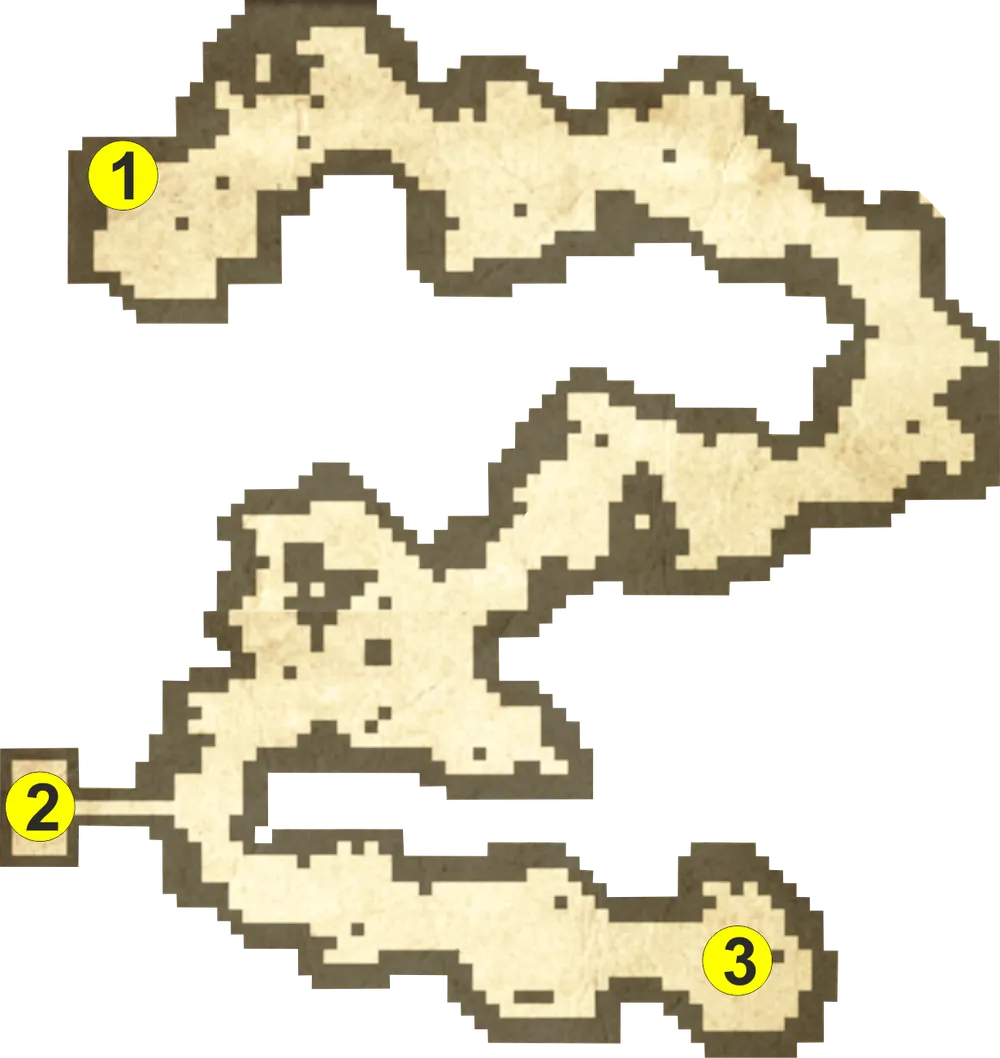 1 - выход. 2 - сундук. Эта пещера населена болотными огоньками, которые миролюбиво отнесутся к вашему появлению. Здесь растет много эпифитов и лечебных трав. После посещения этой пещеры навестите Дайну, проживающую в северо-западном секторе леса. В разговоре с вами она пожалуется на то, что устала от людей, которые жестоко обращаются с животными. Сообщите ей, что нашли для нее чудесное местечко с подземными деревьями и стадом оленей. Дайна очень заинтересуется вашим сообщением (+105 ехр).