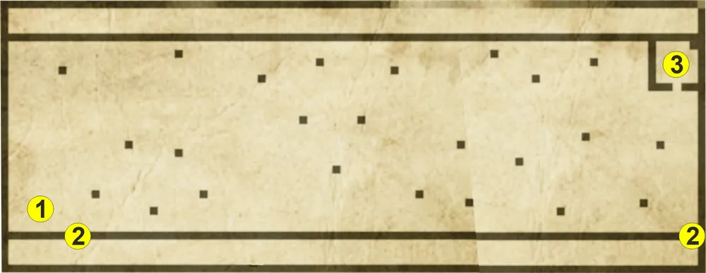 1 - место появления в гробнице. 2 - фальшивая стена. 3 - сокровищница. Обелиски, стоящие в гробнице, будут высасывать из вас здоровье, когда вы приблизитесь к ним. В гробнице можно найти фрагменты дневника солдата, в котором он описывает ужасы, творящиеся в этом месте. Вашей целью является сокровищница, находящаяся в северо-восточной части гробницы. Там вы найдете четвертую часть карты сокровищ. Покинуть гробницу можно по лестнице, которая также находится в сокровищнице.