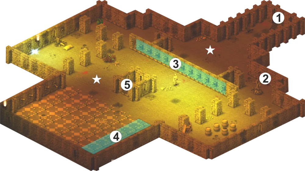 Спустившись в это подземелье по лестнице (1), ликвидируйте ползуна и призрака (их местоположение показано звездочками), а затем заберите с полки пятую часть карты сокровищ (2). Затем установите все рычаги на северной стене (3) в нижнее положение, а рычаги, находящиеся у восточной стены (4), поверните в сторону этой стены. Исчезнет южная стена в сокровищнице (5), где в сундуке вы найдете: ржавые латные перчатки, броню грабителя, кольцо реки, девять древних холстов, руководство по изготовлению оружейной стойки и 35 странных талеров.