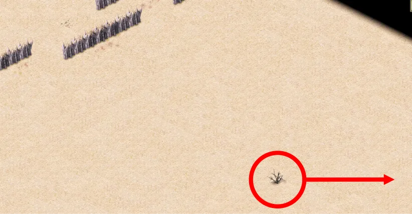 Строго на север от древних руин расположен кустарник, в котором лежит мертвец. на его теле можно найти неплохой меч. К западу от кустарника с мертвецом находится покинутый лагерь. Будьте внимательны, подступы к лагерю усеяны ловушками. К западу от покинутого лагеря находится оазис, населенный пауками. Наконец, к северу от жилища Оррана растет чахлый куст (см. рисунок ниже). Если от него пойти на северо-восток, то можно отыскать подземелье жуков. Жуки, находящиеся там, обездвижены. В северо-западном углу подземелья есть фальшивая стена. Когда вы откроете сундук, стоящий в подземелье, жуки исчезнут, а в подземелье появится гигантский скарабей, которого придется уничтожить (+1 очко обучения).