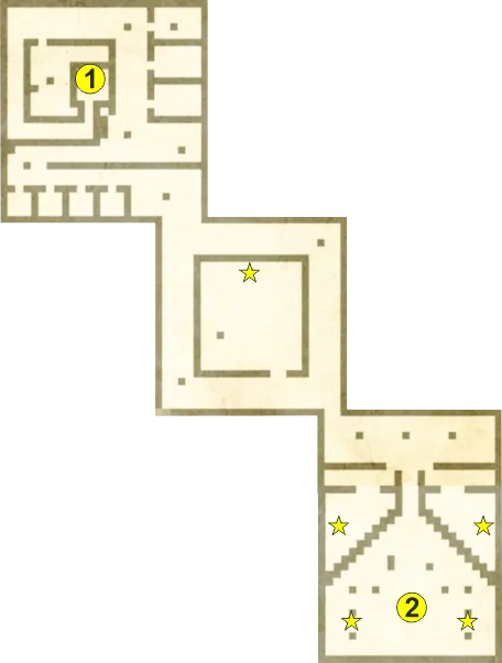 Имеет смысл взять жилище Оррана за исходную точку системы координат, чтобы исследовать данную местность. К югу-западу от жилища есть маленький залив, на берегу которого обитает гигантский краб, убив которого вы заработаете одно очко обучения. К югу от жилища расположена пальмовая роща. Если от ее южной части пойти строго на восток, то вскоре вы наткнетесь на кустарники, где пасутся два раптора, охраняющие сундук. Продолжив от кустарников движение на восток, вы выйдете к оазису, в котором находятся древние руины. В полу этих руин имеется люк, через который вы сможете спуститься в древние катакомбы (см. рисунок ниже).