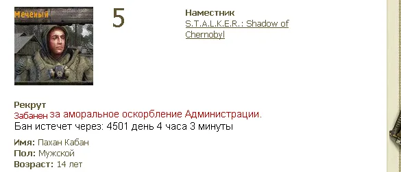 Меня недавно забанили за мат. Первым делом, я очень удивился, что не могу зайти к себе в профиль, потом заметил, что у меня в профиле стоит красная надпись "забанен". Я логично предположил, что бан перманентный(ведь дата не указана) и обиделся на администрацию геймер.ру и на весь мир в целом. Но продолжил заходить на сайт и обнаружил, что меня разбанили. Но это я, а другие могли бы не заходить и так и не узнать об этом. Поэтому предлагаю в профиле писать время, на которое забанен юзер, а также причину, тем самым избавив его от нескольких неприятных минут осознания, что он потерял все, чего достиг и перелопачивания всего сайта, в поисках причины этого. Это может выглядеть примерно так: