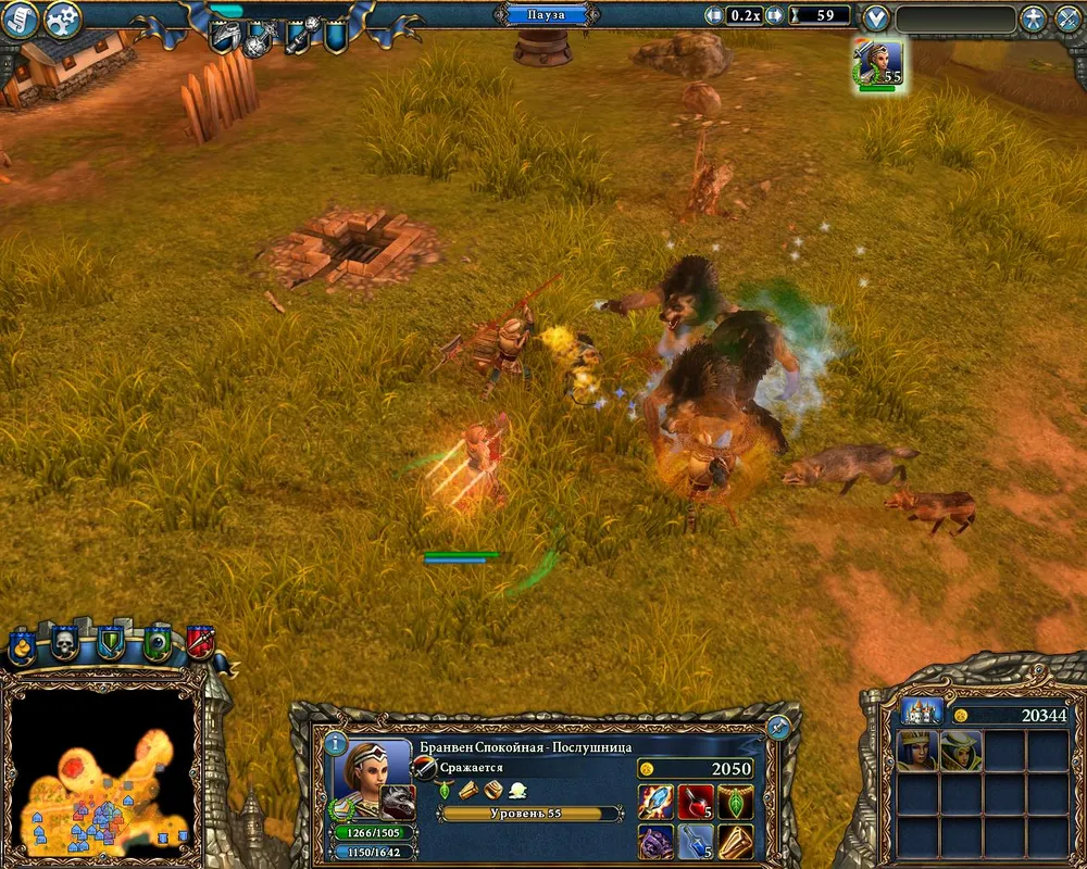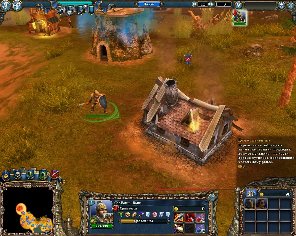Здесь без лордов не обойтись. Никак. Во всяком случае, у меня не получилось… Поочерёдно были вызваны воин 24 уровня и послушница 16 уровня, золота вполне хватило на всё необходимое. (Не пытайтесь вызвать послушницу выше 20 уровня – получите массу проблем из-за острой нехватки золота.) Выяснилась ошибочность предыдущей тактики: начинать зачистку территории нужно не с огров и их пещер, а с домов отшельников. Почему? Огры пойдут в атаку на четвёртый – пятый день, и сами откроют расположение своих жилищ. Если же самостоятельно обнаружить первую пещеру и напасть на неё, атака огров начнётся сразу после её разрушения. Между тем время идёт, и не успеем мы разделаться с ограми, как начнутся атаки волколаков, а это гораздо более серьёзные противники.