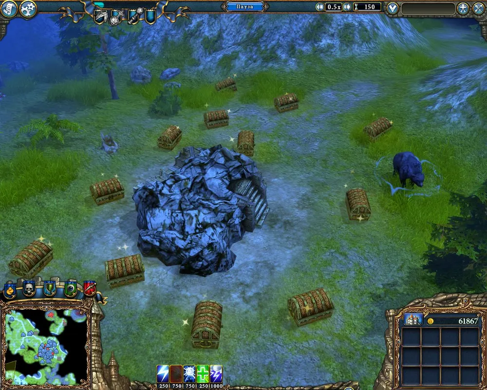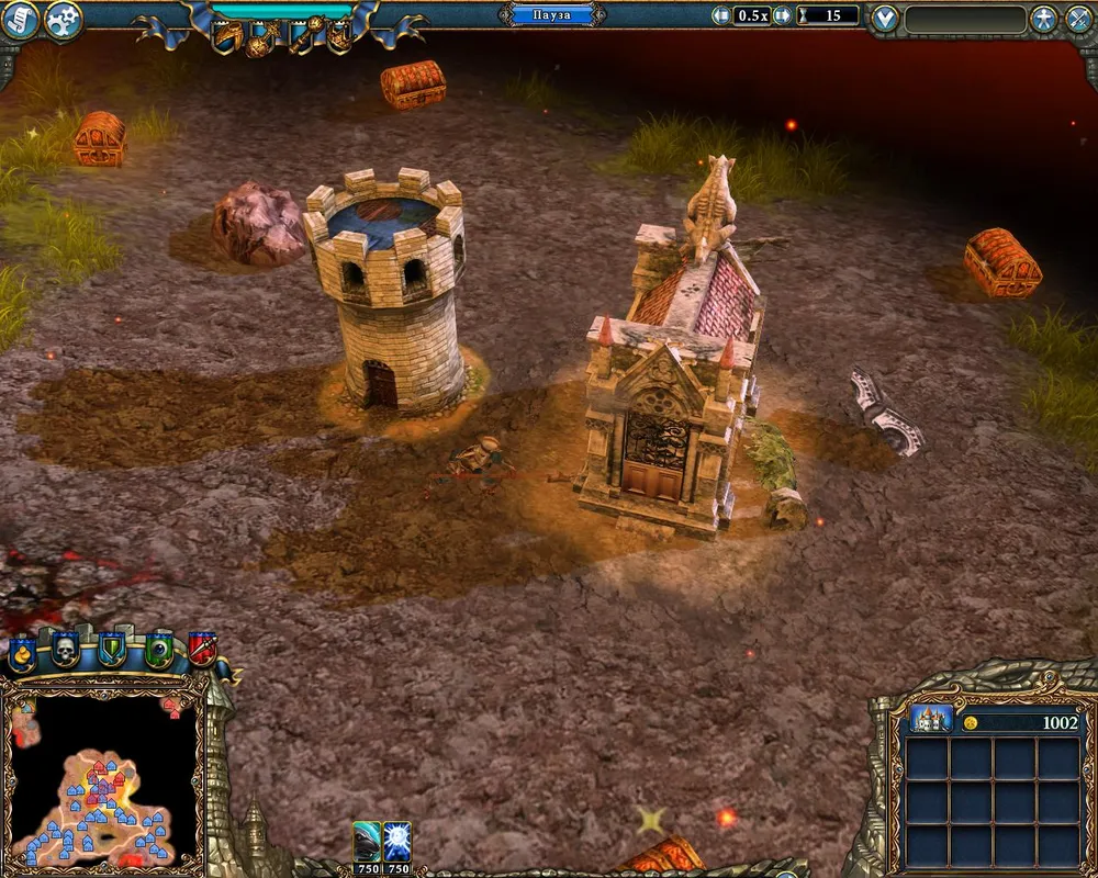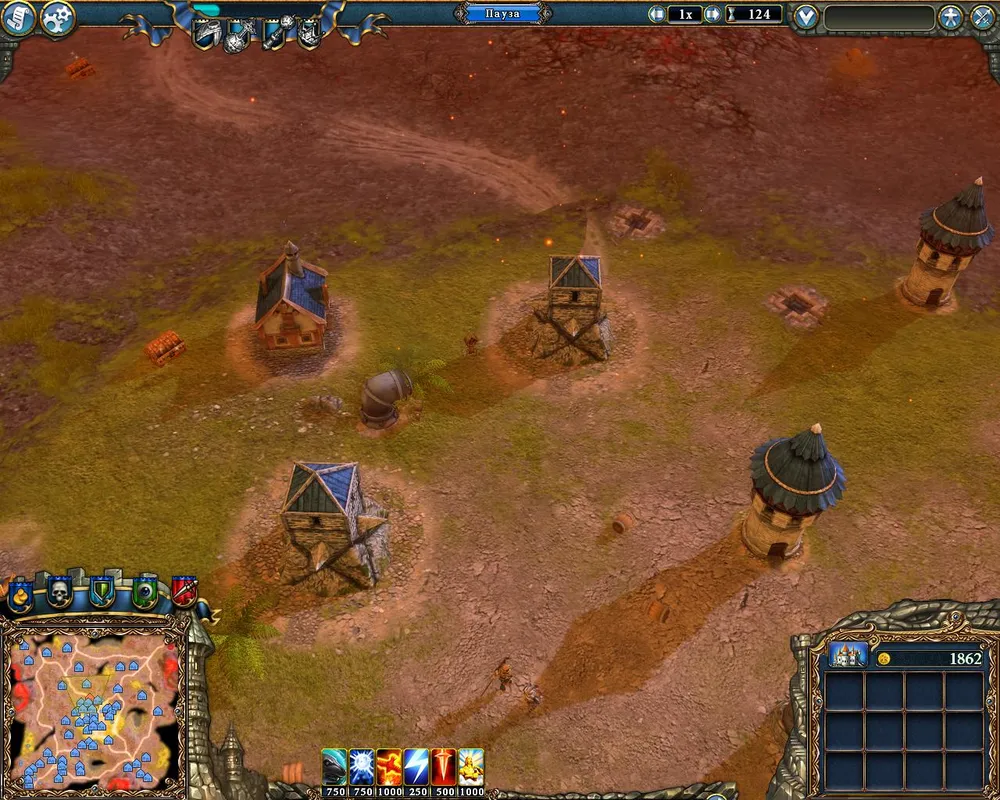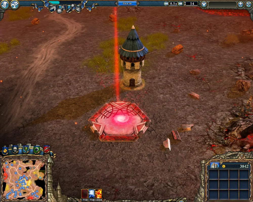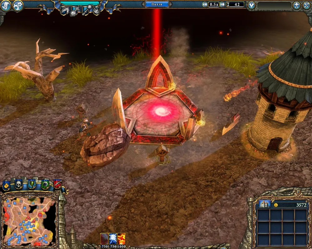 На востоке от замка строим рынок и кузницу – должен открыться торговый пост. Защищаем его охранной башней, которая разрушит ближайшее кладбище. Следующий этап – как можно скорее получить возможность строить башни гномов; их лучше всего возводить не вплотную к замку, а неподалёку от точек, в которых появляются порталы Тьмы. Улучшаем замок и рынок до третьего уровня и окружаем все здания кольцом защиты. На ближайшем доступном месте возводим храм Фервуса: его заклинание «Слово Фервуса» вызывает медведя Хаоса в любой скрытой точке карты. С помощью мишки ведём разведку – стоит поостеречься западного направления – и уничтожаем найденные кладбища и пирамиды минотавров магией. Обнаруженные зеркала тьмы легко уничтожаются несколькими «Штормами молний»; с помощью этого же заклинания разрушаются два кладбища в северо-восточном углу карты.