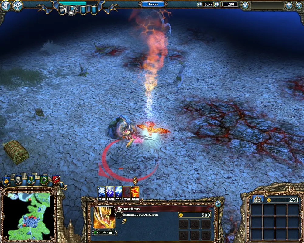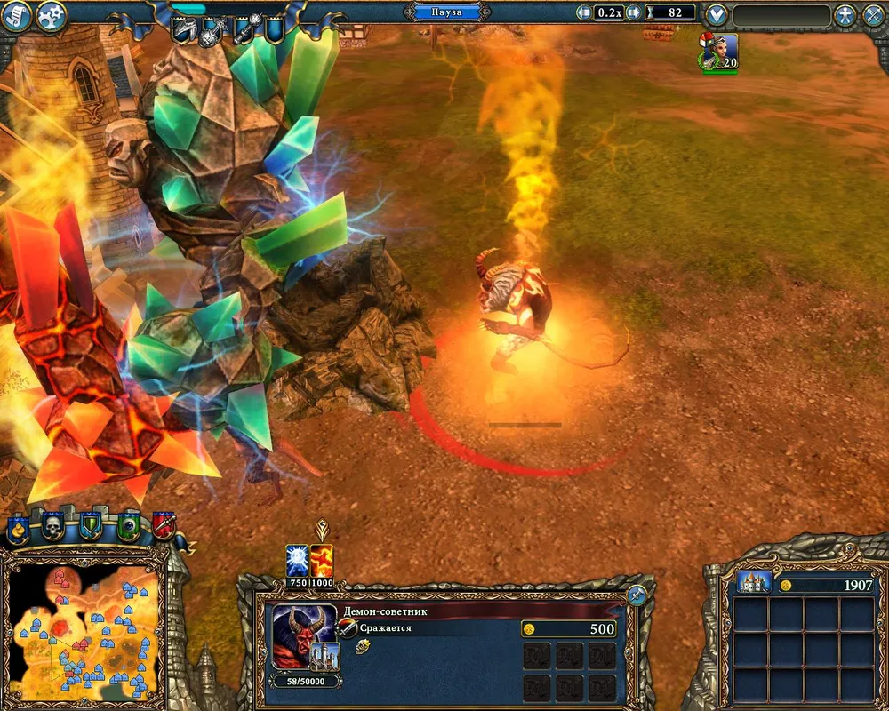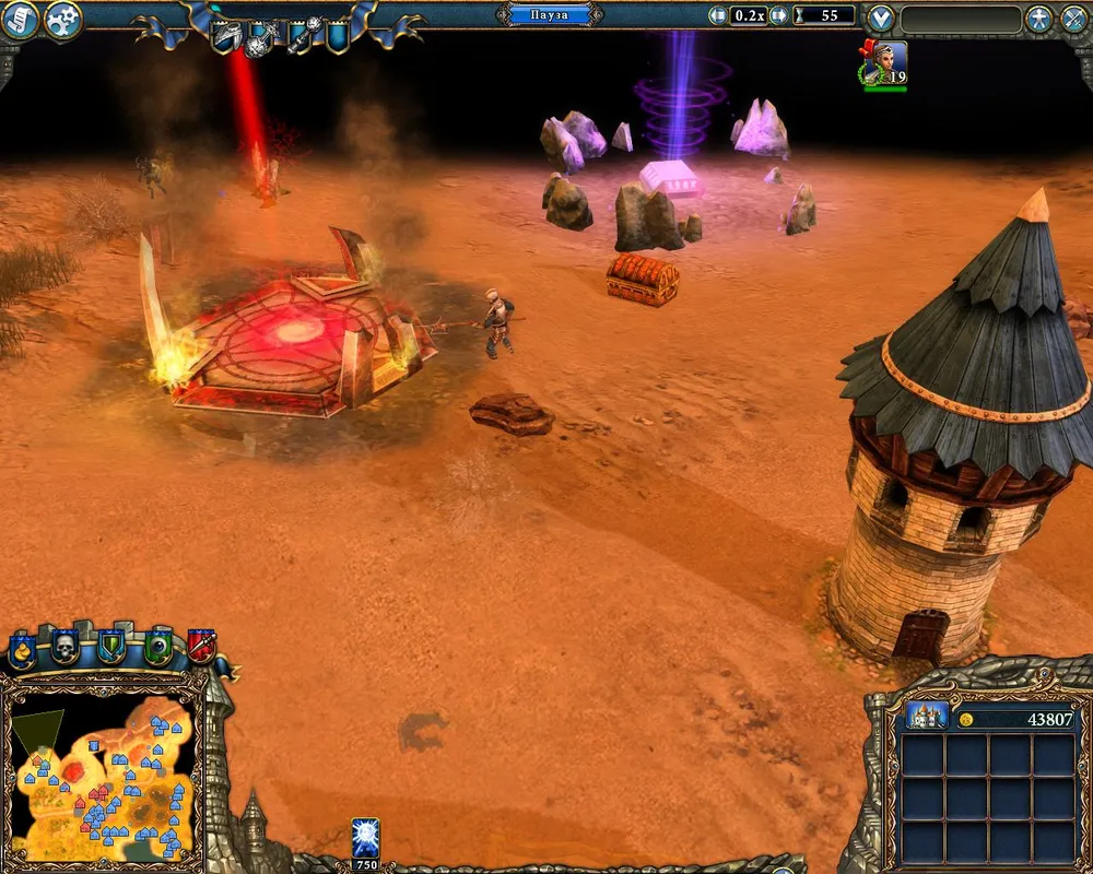Выставляем скорость игры на 0,5. С помощью «Наговора камня» возводим на открытых местах храмы Дауроса, Агрелы и Хелии – троны элементалей исчезнут, элементали огня – тоже. А вот элементали молнии исчезать не желают, и способны доставить немало хлопот!
