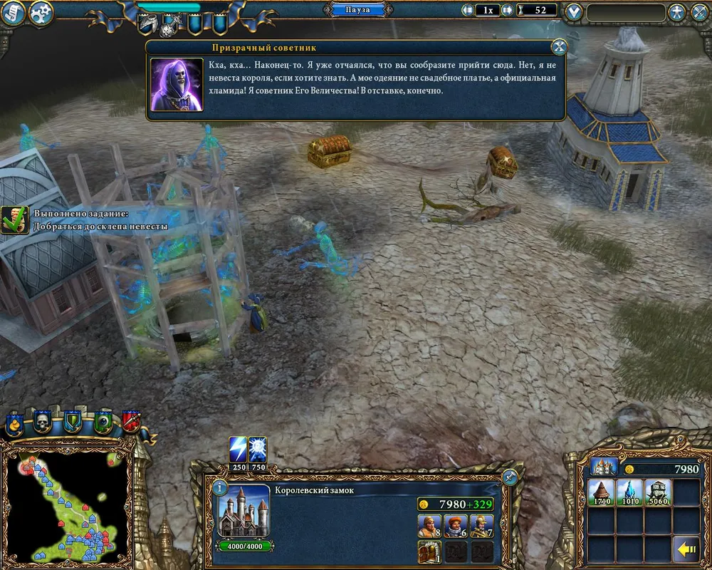 Возле пещеры возводим магическую башню, отстраиваем торговый пост и защищаем его башней гномов. Пол мере накопления золота тянем вторую цепочку из зданий в северо-западный угол. Заказываем строительство охранной башни рядом со склепом, окружённым призраками. Крестьянка, подошедшая к стройке, активирует квест, и король останется без свиты.