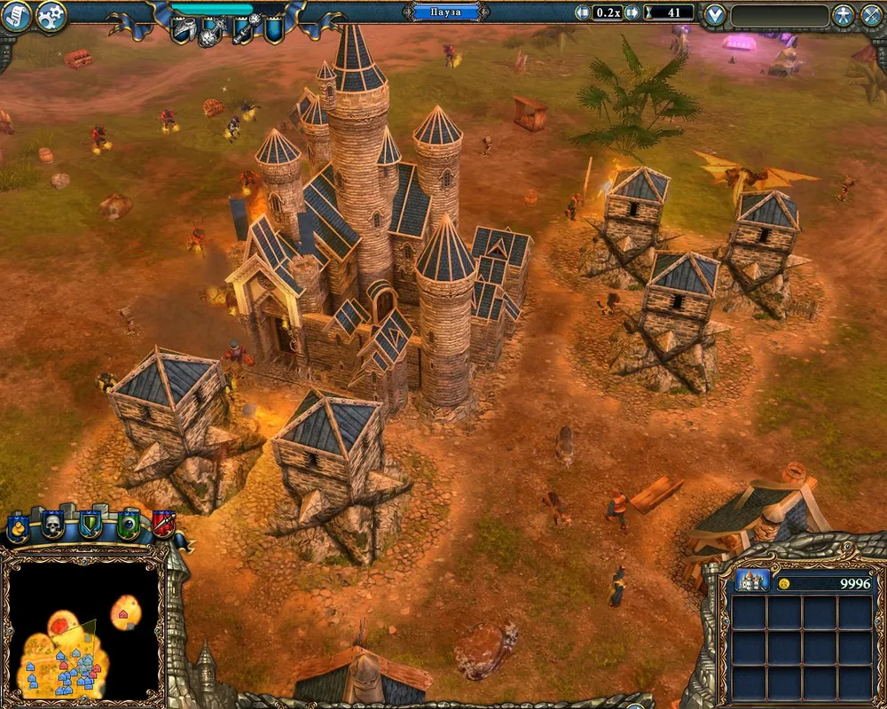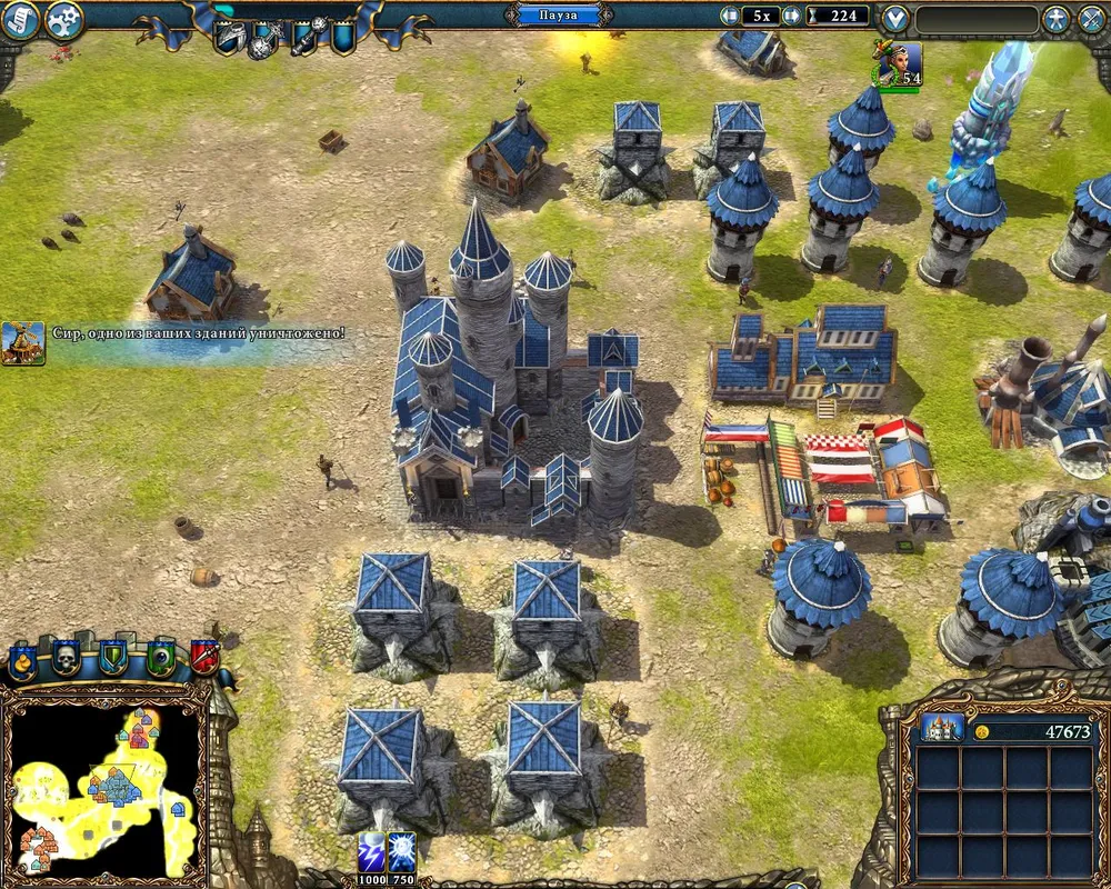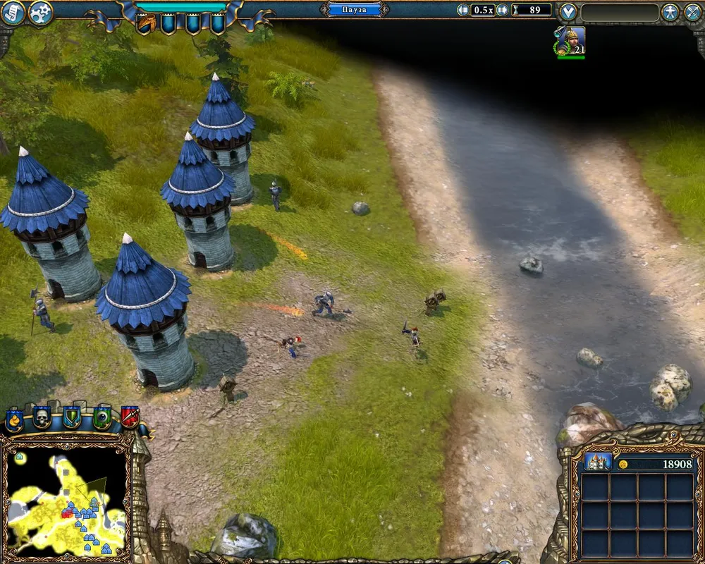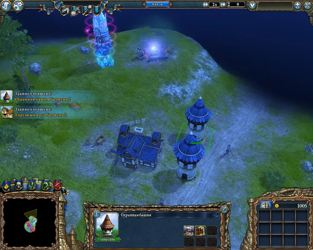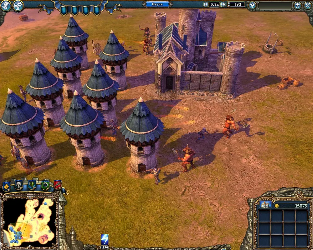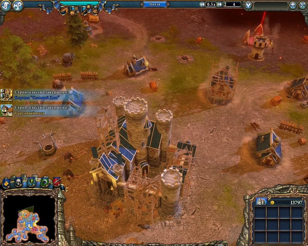 У южного края карты возводим рынок (нельзя поднимать его уровень до второго!), магическую лавку и ещё одну охранную башню; чтобы сборщику налогов не приходилось бегать далеко. Ещё несколько охранных и магических башен отстраиваем у входа в замок — сколько успеем.