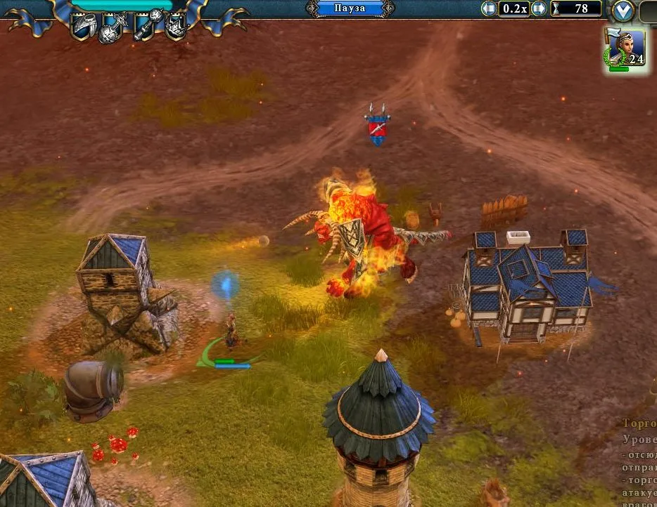 Таким же образом уничтожаем башни вокруг замка. Теперь ставим флаг атаки на замок, и как только лорд завяжет бой с бесами, возводим за его спиной три-четыре охранных башни: они помогут в сражении.