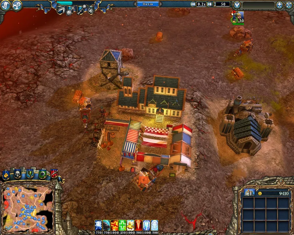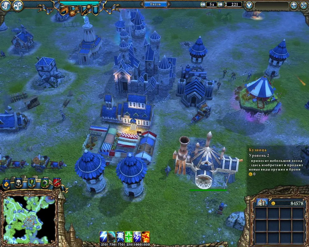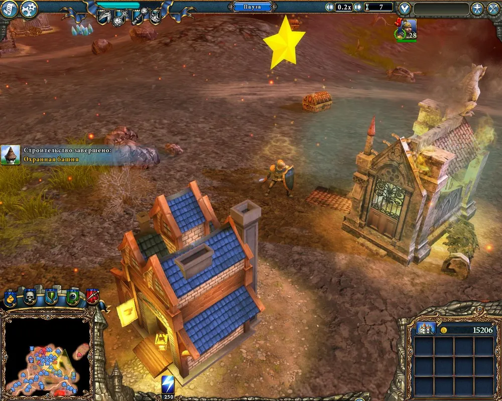 Пока вызванный лорд разрушает всё, что может, улучшаем замок и кузницу до второго уровня, чтобы в юго-западном углу карты возвести гильдию гномов.