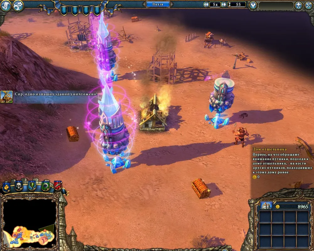 У места обитания Андревуса возводим магическую башню так, чтобы она была вне досягаемости огня защитных сооружений мага и начинаем разрушать их заклинанием «Молния». Уничтожив две башни, переносим огонь на центральное сооружение.