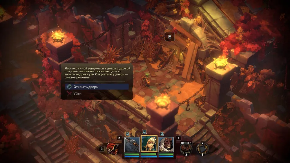 Вот теперь Смотритель могил обрел плоть и будет за нами гоняться, чтоб убить. Он опасен тем, что наносит колоссальный урон в одну цель. Я выбрала вариант двух персонажей с большим уроном и того, кто может лечить. Желательно конечно, чтоб у вас и могучие удары были заряжены. В общем, вам надо пережить огромный урон от его способности и убить его до того, как он сможет использовать её снова. Можно увеличить здоровье своим героям, перекинув таланты в жизнь и защиту. За убийство получим ключ, который понадобится в последствии, а Раха выдаст неплохую куртку.