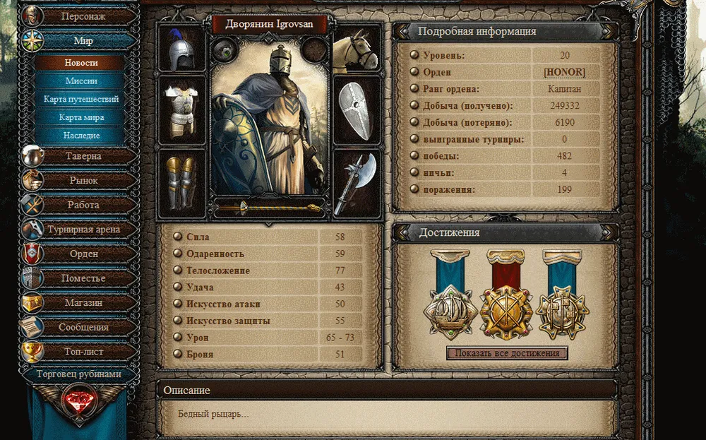 Вот главное окно персонажа, тут видно практически все, и ваши достижения, и количество ваших побед/поражений, и количество добычи, и т.д. и т.п. :