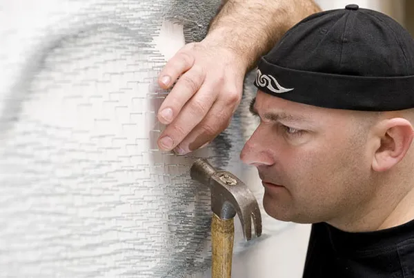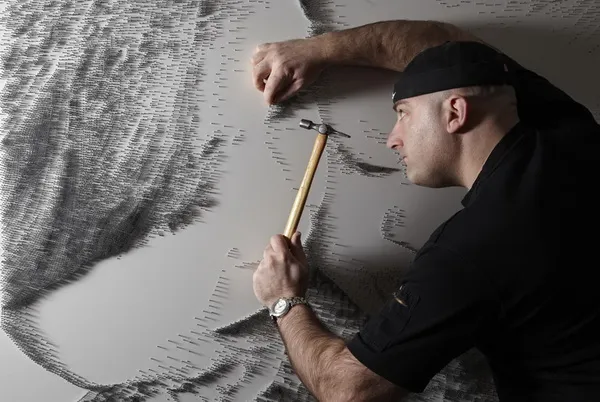 Забивая гвозди в деревянные панели на разном расстоянии друг от друга, Маркус создает невероятные картины.