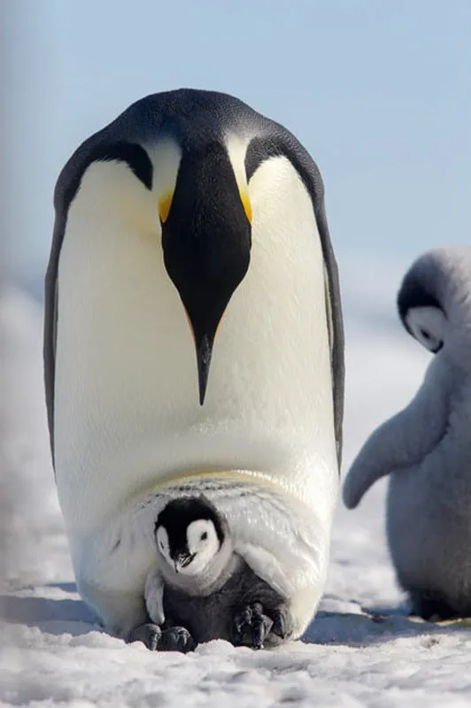 Детеныш императорского пингвина выглядывает из-под ног своего отца на острове Сноу Хилл в море Уэдделла, Антарктика.