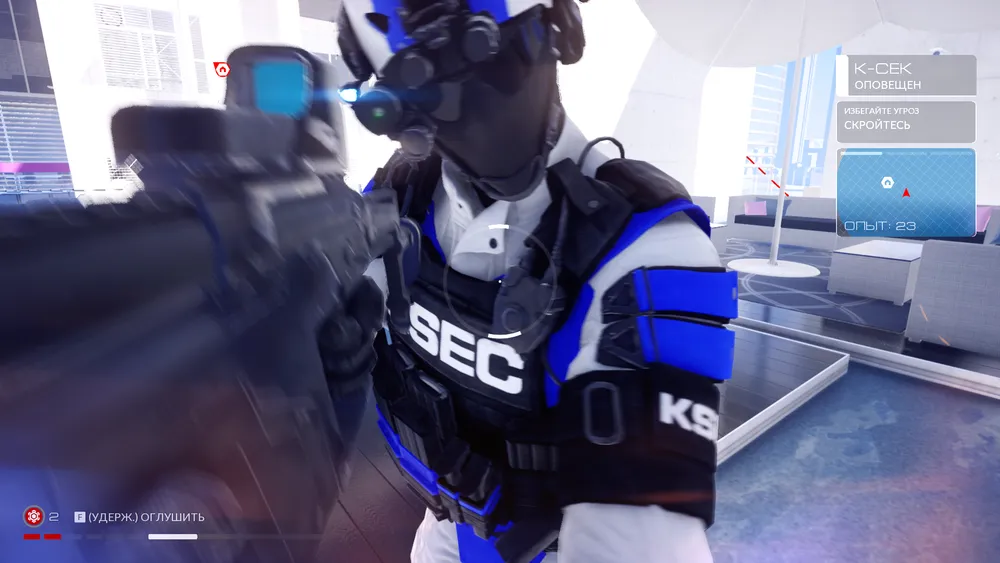 Впрочем, нельзя сказать, что городское окружение вообще никак не реагирует на Фейт вне квестов и заданий. Чтобы началась движуха, бегущей достаточно попасть в поле зрения камер видеонаблюдения. Спустя несколько секунд срабатывает сигнал тревоги, и на ее задержание отправляется несколько отрядов быстрого реагирования. Серьезной опасности, как я уже писала выше, для жизни и здоровья девушки эти ребятки не представляют, но пока она не скроется, большинство заданий и испытаний оказываются заблокированными – их значки попросту исчезают с глобальной карты. Ни тебе рекламный щит хакнуть, ни заказ на бандерольку принять. Однако нет худа без добра. За уход от преследования тоже начисляется опыт, порой даже более солидный, чем за иной рядовой мини-квест.
