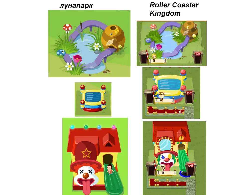 Некоторые комментаторы отметили, что пара элементов в Лунапарке частично похожи на Roller Coaster Kingdom. Художники при создании игры действительно вдохновлялись ИДЕЯМИ аттракционов из Roller Coaster. При этом важно, что они рисовали эти аттракциона с нуля руками. Давайте внимательно сравним три приведенных на скриншоте аттракциона с аттракционами из Roller Coaster Kingdom: