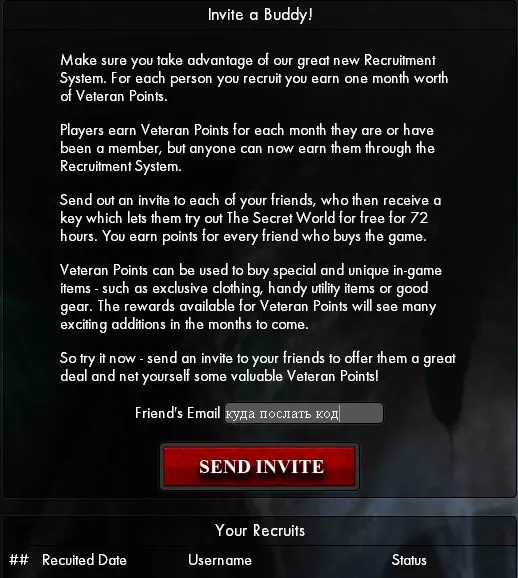 С выходом обновления №6 в The Secret World появилась система рекрутирования. По сути это альтернатива бесплатным бета-выходным, которые были перед выходом игры.