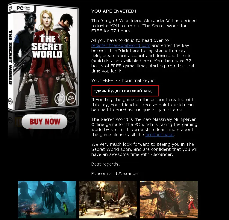 3. Если вы зайдёте на сайт игры и зарегистрируете новый аккаунт введя код из письма, то получите 72 часа бесплатной игры (время считается с момента первого захода в игру). За это время вполне можно успеть бегло ознакомиться с одной-двумя локациями (гид по Кингсмауту вам в помощь) и оценить стиль и атмосферу The Secret World. А если хотите, можете опробовать мультиплеер, который в дополнении был улучшен.