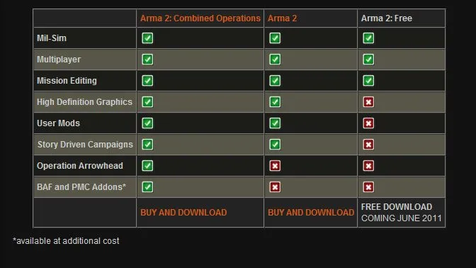 Bohemia Interactive объявила, что летом этого года выпустит бесплатную версию сумулятора боевых действий ArmA 2. Проект будет называться ArmA 2: Free и будет почти идентична полной версии, за исключением сюжетной компании, и поддержки HD-графики и пользовательских аддонов. Наиболее интересным из всего, является то, что ARMA 2: Free будет совершенно бесплатна, но не только бесплатной игрой, но и никаких микро-транзакций. Это может быть хорошим поводом опробовать игру, перед наступающей Arma 3.