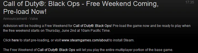 Activision устраивают бесплатные выходные для Black Ops. Уже можно предзагрузить игру и готовиться к бесплатным выходным, которые стартуют в четверг 2 июня, в 10:00 по Тихоокеанскому времени.